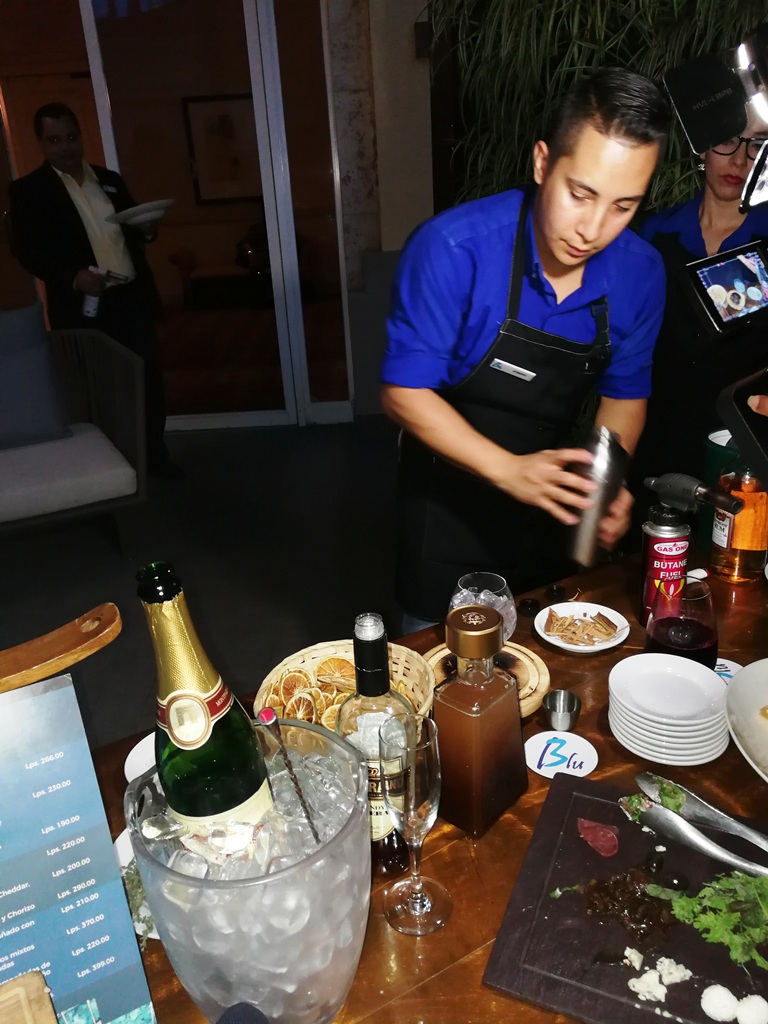 Luego llego el Chef Juan Rojas con el nuevo menú del bar, Nachos, Conchas de Papas rellenas, alitas de pollo, ceviche, pizza, sushi entre otros es la variedad de bocadillos que se pueden disfrutar a precios sumamente accesibles en BLU, un bar diseñado para que puedas ver el atardecer de Tegucigalpa, quitarse la corbata y relajarse.