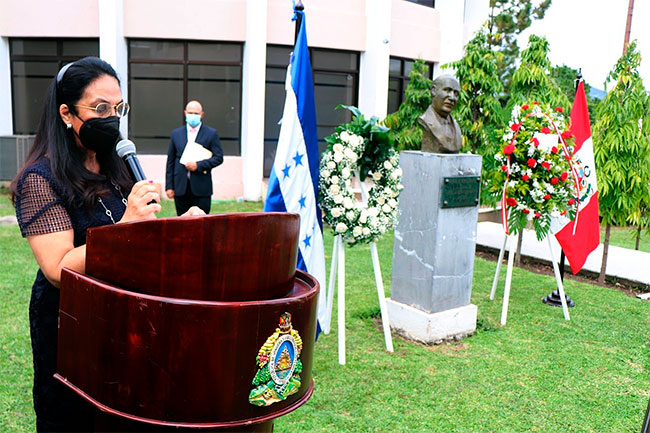 La embajadora del Perú, Ana Marina Alvarado de Díaz, agradeció a Honduras y a la Cancillería por realizar el homenaje como parte de la conmemoración del Bicentenario de la independencia que celebran tanto Honduras como el Perú.