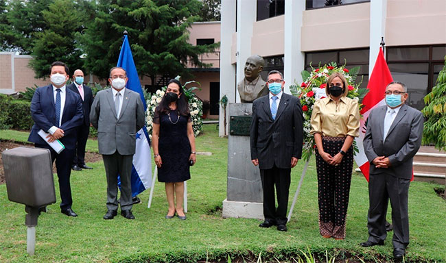 Tegucigalpa, 19 de octubre de 2021. Autoridades de la Cancillería y de la embajada del Perú en el país, rindieron hoy homenaje al ex mandatario peruano José Luis Bustamante i Rivero en reconocimiento a sus contribuciones para promover la paz y las buenas relaciones diplomáticas entre Honduras y El Salvador.