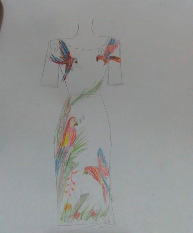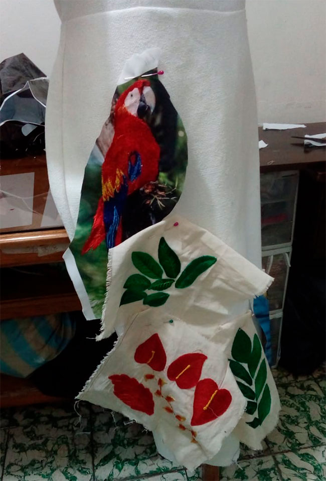 El diseñador intibucano Roberto Ramírez, quien por sexta ocasión confecciona el vestido de la primera dama, explicó que el atuendo es un clásico de corte largo inspirado como siempre en la flora y fauna del país, pero en esta ocasión destacará el Ave Nacional de Honduras, la Guara Roja.