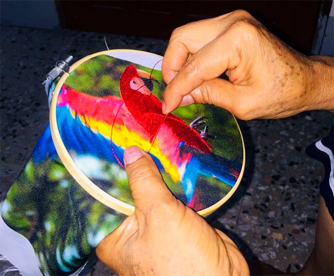 Esta versión está basada en el Ave Nacional de Honduras, la Guara Roja, cuyas imágenes fueron incorporadas a través de la técnica de sublimación (impresión sobre tela) y de ahí se tomó patrón para que fueran bordadas de forma artesanal por las hermanas Antonia, Lidia e Idalia Orellana, originarias de la comunidad de Peña Blanca, en Santa Cruz de Yojoa, Cortés. Ellas trabajaron por varias horas para que los acabados de los bordados fuesen nítidos.