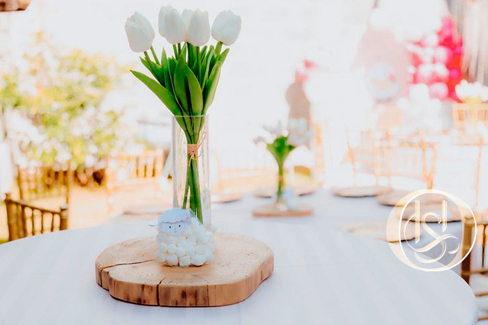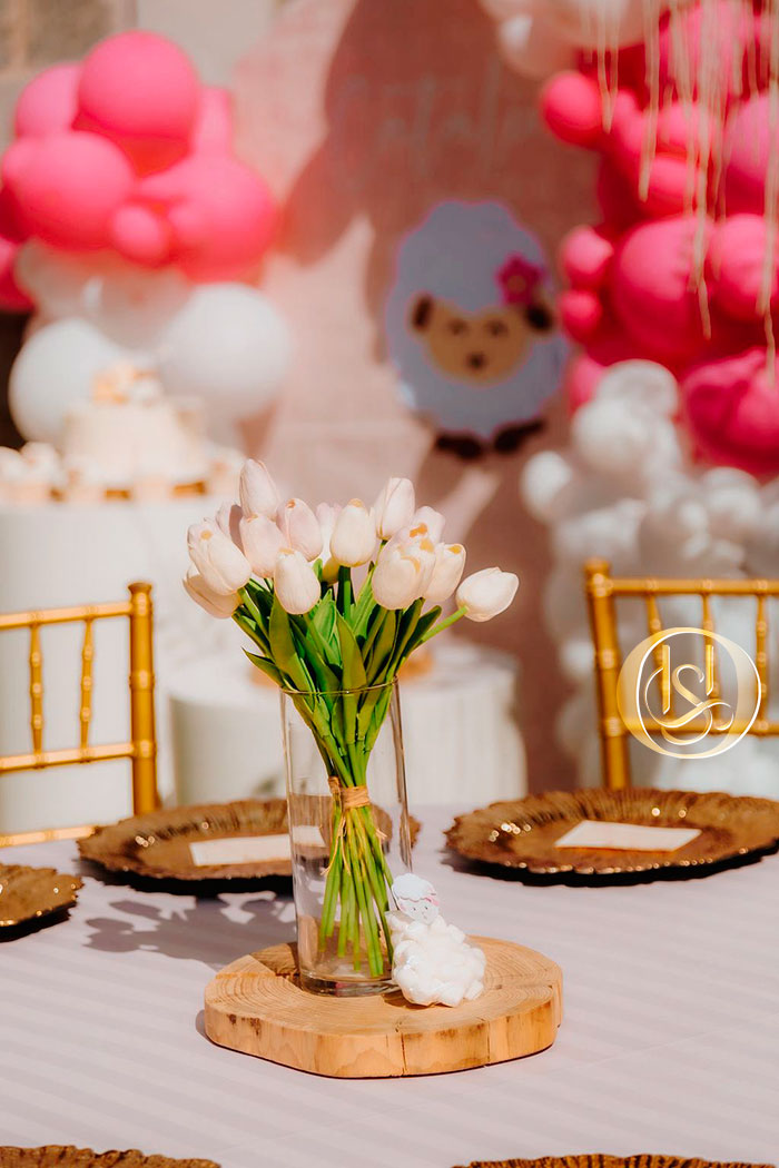 La alegre celebración prenatal fue organizada por Reina Santos, María José Padgett y Crista Corrales; quienes decoraron las estancia con tonos rosa, blanco,dorados y delicados detalles en la mesa central como ser tiernas ovejitas y hermosos tulipanes blancos inspiración de la decoración por SM Detalles.