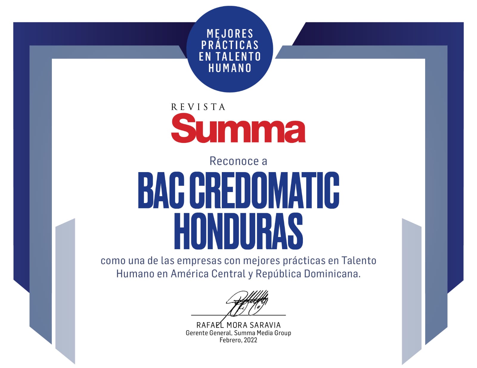 • La Revista Summa reconoce a BAC Credomatic como el banco número uno en el ranking de gestión del Talento Humano en Honduras.