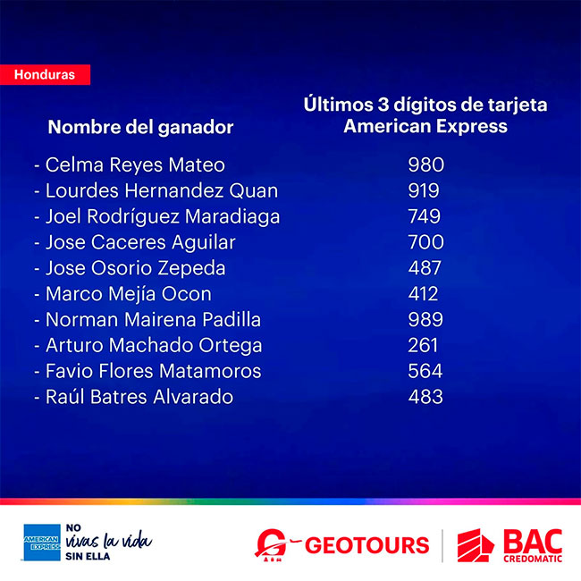 Los ganadores de la promoción fueron seleccionados aleatoriamente en un sorteo realizado el 18 de febrero con la presencia de ejecutivos de BAC Credomatic y un notario público, quien dio fe de su realización. Después se les contacto personalmente y se publicó en redes sociales el nombre de los siguientes ganadores: