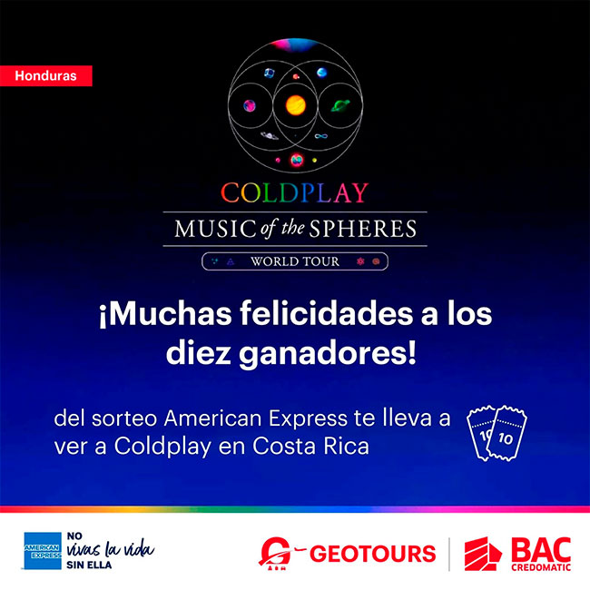 Honduras.- BAC Credomatic y American Express, lanzaron una exclusiva promoción en la cual los clientes tenían la oportunidad de participar para ser uno de los ganadores de 10 paquetes dobles y vivir el concierto “Music of the Spheres”, de la reconocida banda internacional Coldplay, la cual se presentará en el Estadio Nacional de Costa Rica, este 18 y 19 de marzo del 2022.