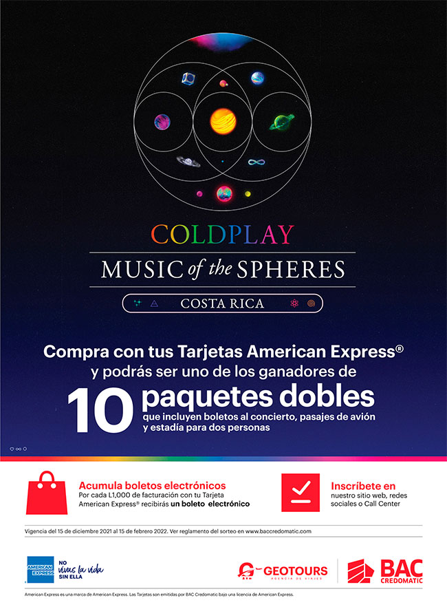 Honduras.- BAC Credomatic y American Express, nuevamente premiando la lealtad de sus clientes, presentan exclusiva promoción en la cual sortearán paquetes dobles para que 10 afortunados ganadores y sus acompañantes puedan disfrutar del concierto “Music of the Spheres”, de la reconocida banda internacional Coldplay. El concierto se realizará en el Estadio Nacional de Costa Rica, el próximo 18 y 19 de marzo del 2022.