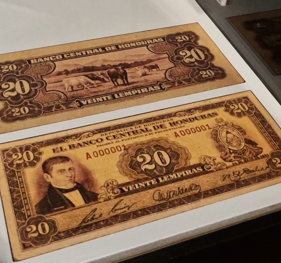 La exhibición también reúne documentos originales y piezas de alto valor simbólico, incluyendo las primeras emisiones de billetes, el decreto de creación del BCH, el discurso inaugural, registros contables históricos y medallas conmemorativas emitidas por el Banco.