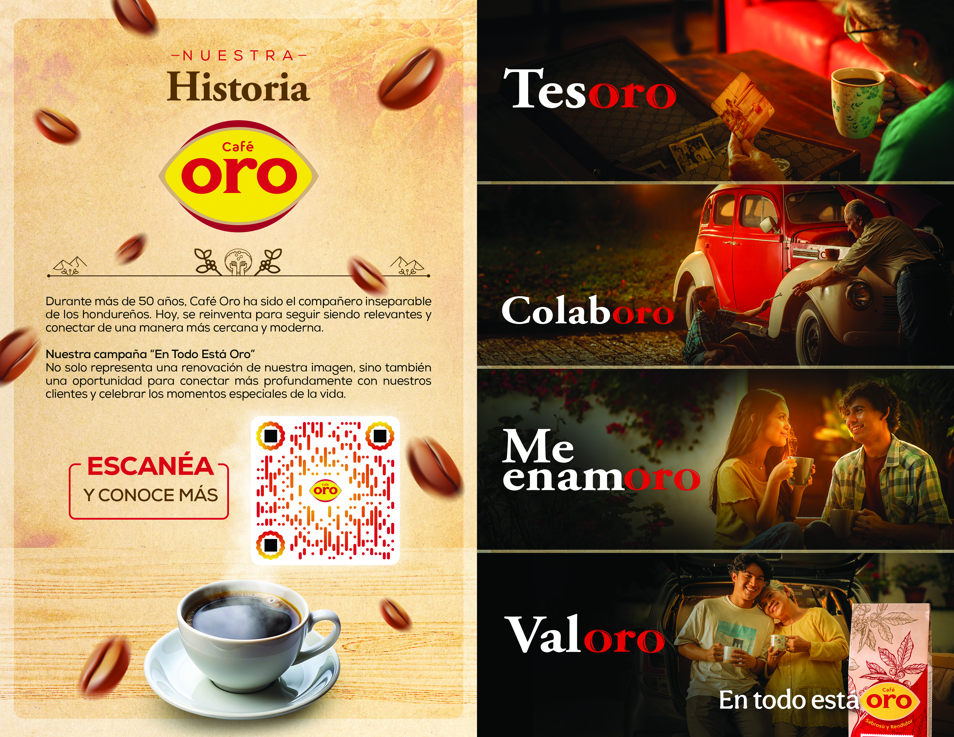 Con un diseño más moderno y un lenguaje más cercano, la nueva identidad de Café Oro refleja la evolución de la marca sin perder su esencia. Cada detalle ha sido cuidadosamente seleccionado para transmitir la calidez, la tradición y la calidad que han caracterizado a Café Oro durante décadas.