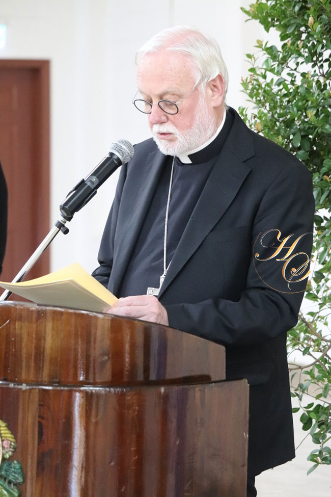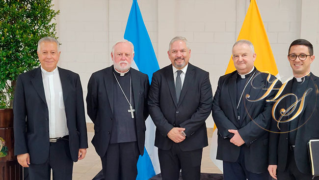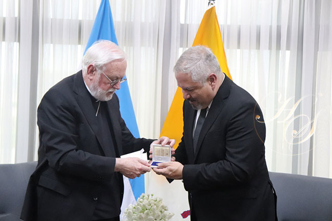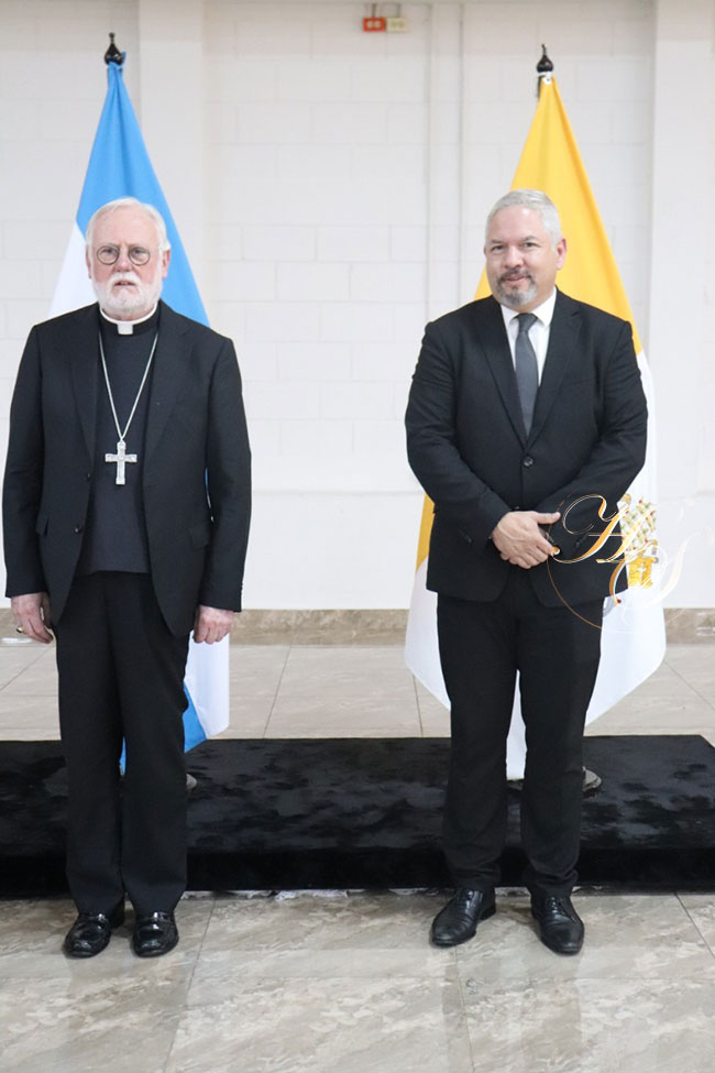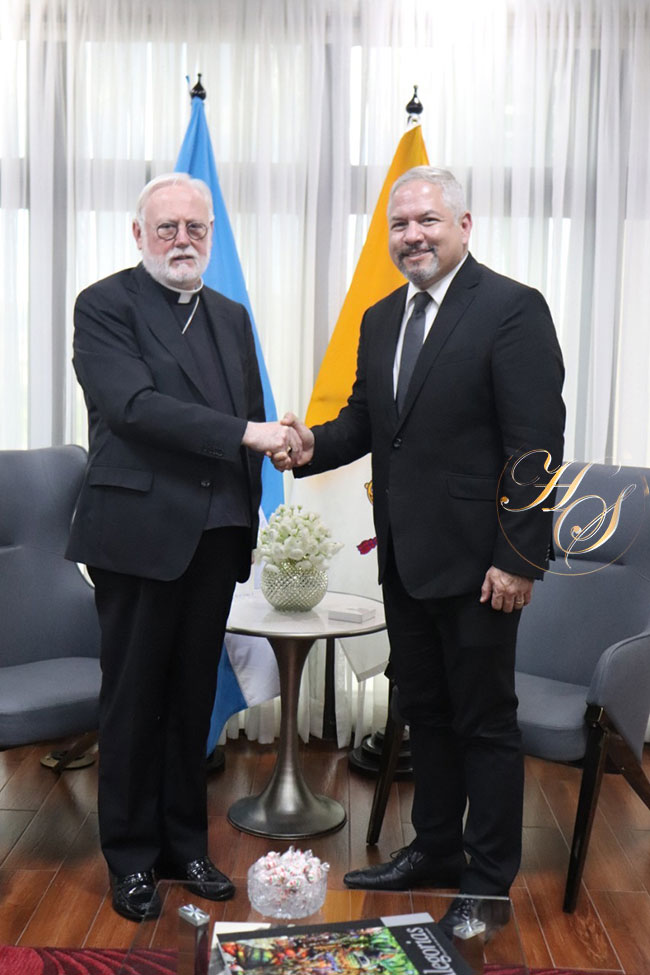 El Canciller Eduardo Enrique Reina atendió en su Despacho, la importante visita de Su Excelencia Reverendísima Paul R. Gallagher, Secretario para las Relaciones con los Estados de la Santa Sede, quien visita el país con la finalidad de ampliar las relaciones de respeto entre ambos Estados.