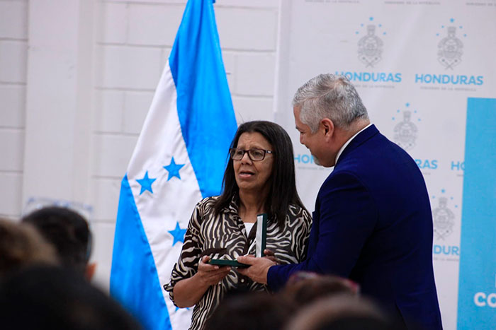 La Condecoración por su destacado servicio en esta Secretaría durante la administración del Presidente Zelaya “Orden Dionisio de Herrera al Mérito Civil” fue entregada a Héctor Alberto Maradiaga y por sus más de 35 años de servicio para Martha Ordoñez Fuentes.