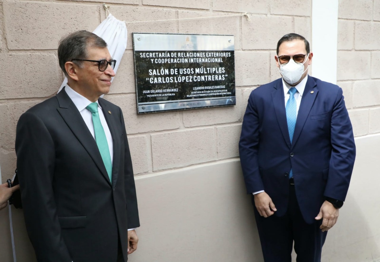 La actividad, que incluyó la develación de un busto y de una placa conmemorativa para el salón de usos múltiples que llevará el nombre del embajador López Contreras, fue liderada por el canciller Lisandro Rosales Banegas.