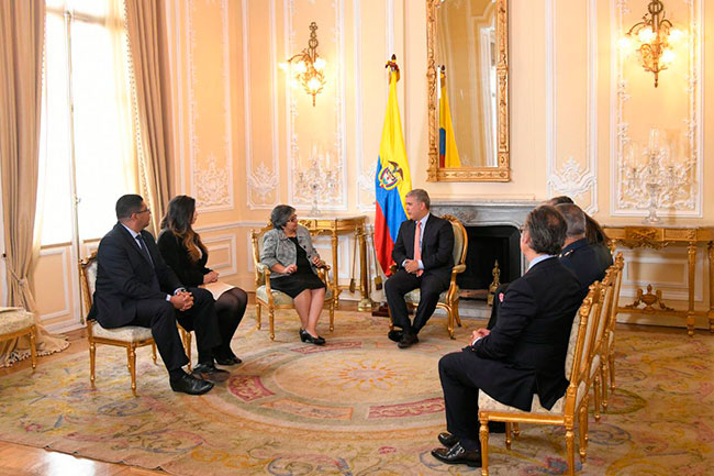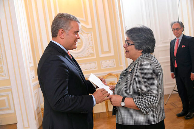 La señora embajadora María Antonia Navarro Bustillo, presentó sus Cartas Credenciales ante el señor Presidente Iván Duque Márquez, que la acreditan como la nueva Embajadora de la Republica de Honduras ante el pueblo y gobierno de Colombia.