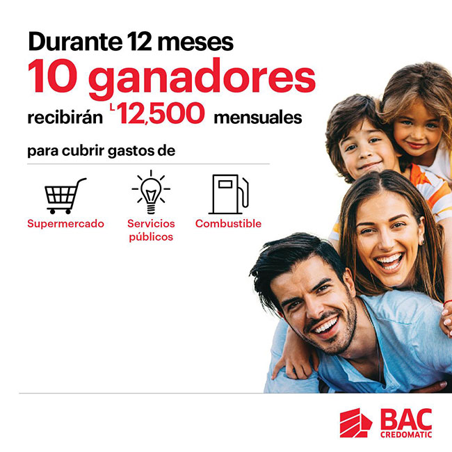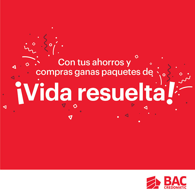 Con tus ahorros y compras con tarjetas de crédito y débito de BAC Credomatic puedes ganar un paquete de Vida Resuelta por un año, convirtiéndote en uno de los 10 felices ganadores que, durante 12 meses, recibirán L12,500 mensuales para cubrir gastos de: Supermercado, servicios públicos o combustible.
