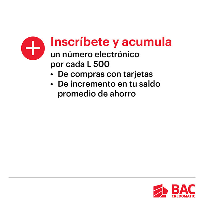 • Una vez inscrito, acumularás un número electrónico por cada L500 en compras con sus tarjetas de crédito o débito de BAC Credomatic o de incremento en tu saldo promedio de ahorro.