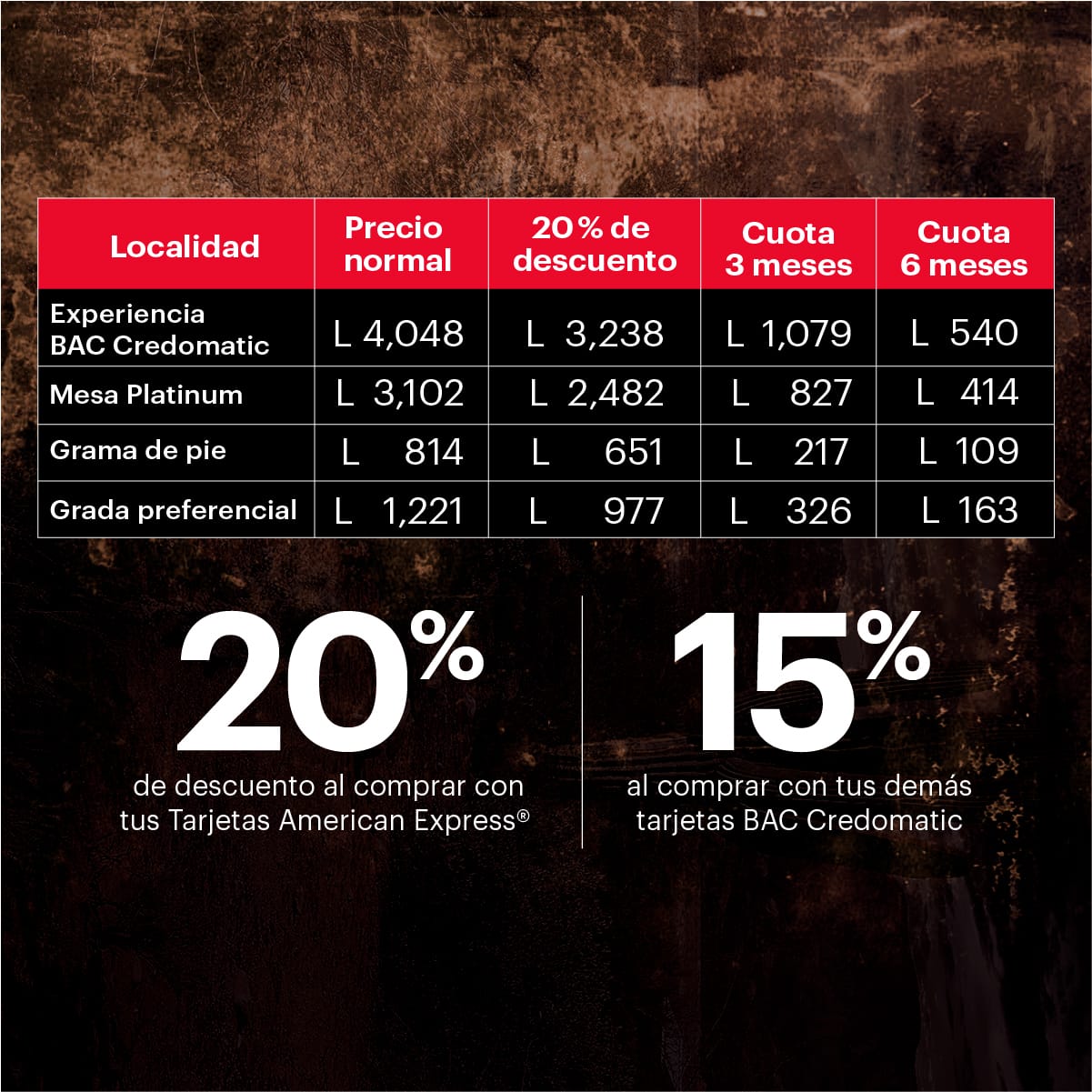 Los clientes de BAC Credomatic, podrán adquirir sus entradas a experiencia BAC Credomatic, mesa platinum, grama de pie y grada preferencial con los siguientes distintivos beneficios, al comprarlos con sus tarjetas de débito o crédito de BAC Credomatic desde las páginas web www.mipromo.com o www.eticket.hn y en puntos de venta de eticket a nivel nacional: