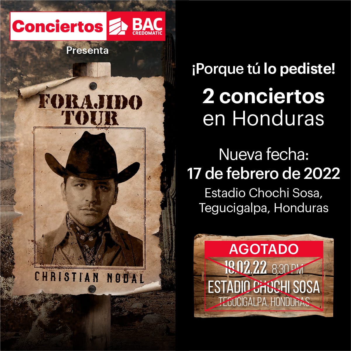 Honduras. Conciertos BAC Credomatic, junto a la casa productora Arceyut Producciones, anunciaron una segunda fecha de concierto del exitoso y popular cantautor mexicano Christian Nodal, con su gira 2022 “Forajido Tour”. Debido a la enorme demanda de los hondureños, se harán dos presentaciones el 17 y 18 de febrero. Ambas presentaciones se llevarán a cabo en las instalaciones del Estadio Chochi Sosa en Tegucigalpa, con las mismas localidades, precios y protocolos de bioseguridad.