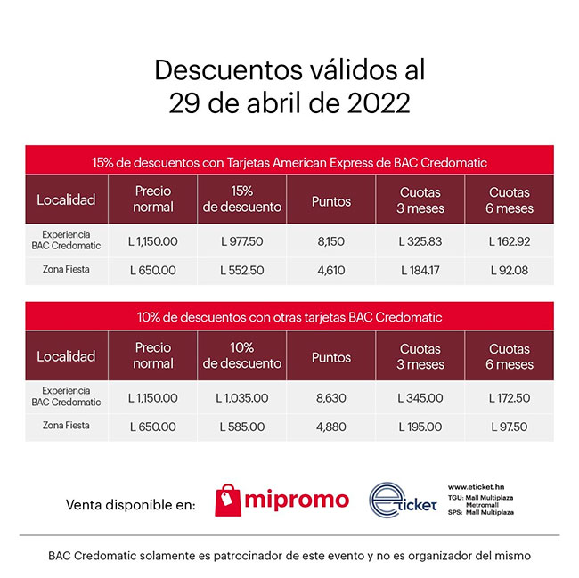 Si deseas conocer más información acerca de los precios y promociones, ingresa a la siguiente página: https://www.eticket.hn/paso1a.aspx?idevento=24545