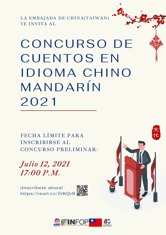 La Embajada de Taiwán, INFOP y la Asociación de Hondureños Egresados de Taiwan (AHET) te invitan a participar en el Concurso de Cuentos en Idioma Chino Mandarín 2021. Para más información ingresar a https://www.facebook.com/taiwan.embassyhn/ y https://www.facebook.com/INFOPOFICIAL/.