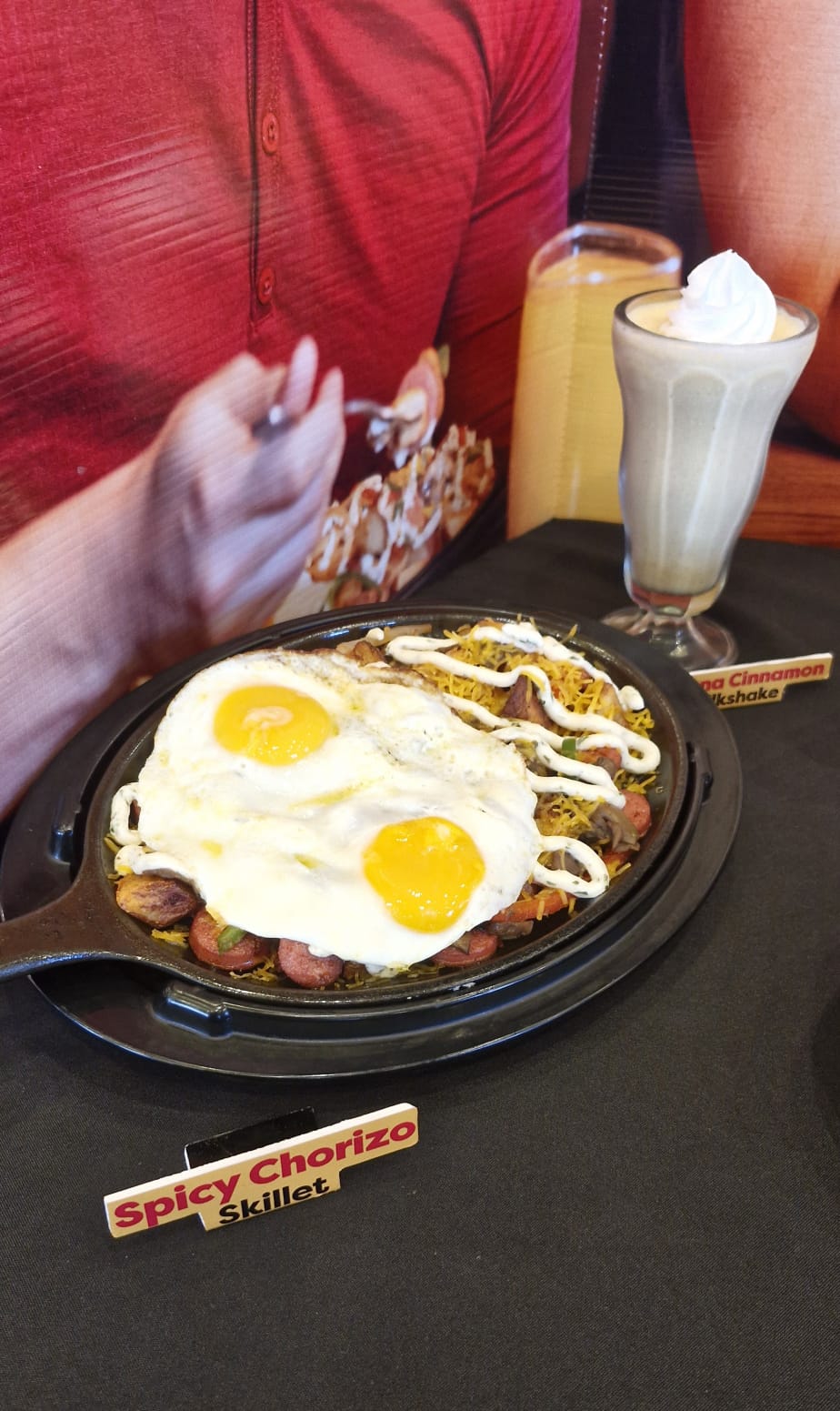 Spicy chorizo skillet:  Sabroso chorizo,  papas rojas sazonadas,  pimientos y cebolla frescos, queso cheddar, champiñones, huevos perfectamente cocinados coronado con nuestra salsa mayo chimichurri.