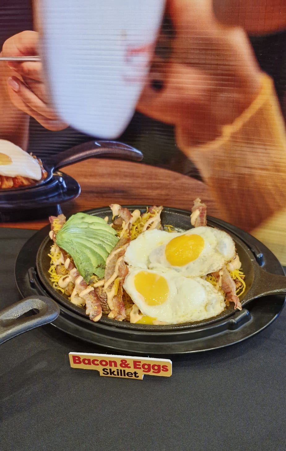 Bacon and eggs skillet: Disfruta de crujientes tiras de bacon, papas rojas sazonadas, huevos perfectamente cocinados, pimientos y cebolla frescos, aguacate y queso cheddar. Coronado con nuestra irresistible salsa creamy BBQ. (opción de papas rojas o Hash brown)