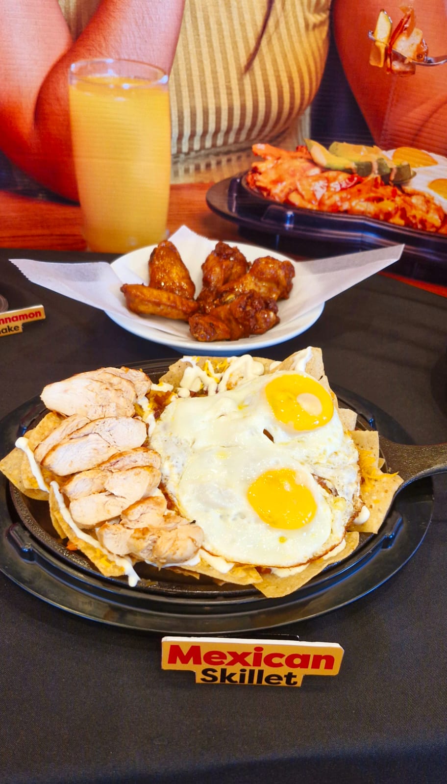 Mexican skillet: Deléitate con la perfecta combinación de tortillas chips crujientes, queso cheddar, jugoso pollo sazonado, huevos, salsa roja y salsa verde acompañado de frijoles rancheros coronado con crema acida.