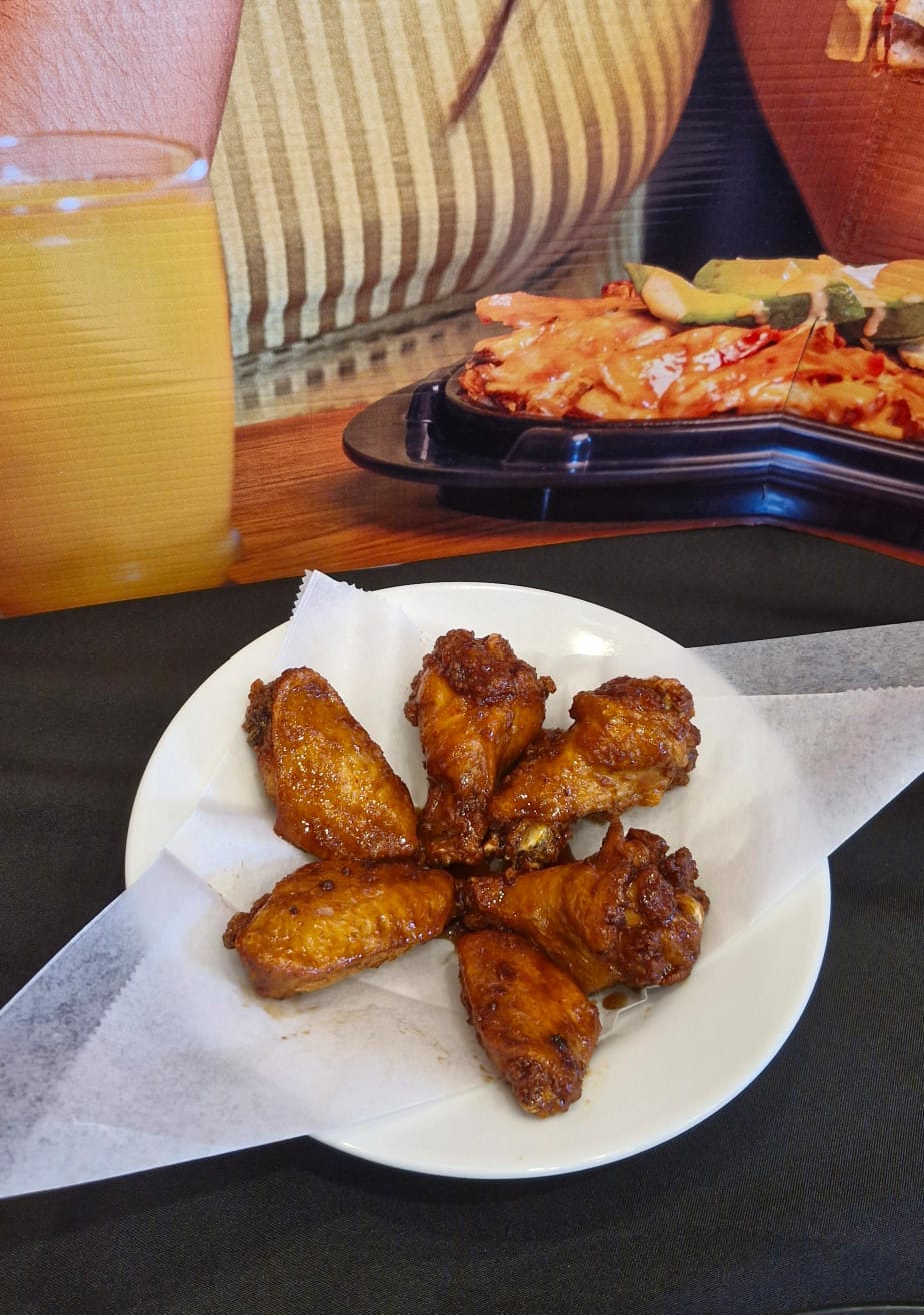 Hot honey wings: Orden de 6 alitas grandes fritas bañadas en salsa hot honey. Servidas con la salsa dip de tu elección.
