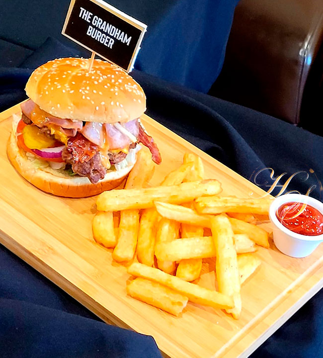 Para los de gran apetito, su favorita sin duda alguna será la Grandham Burger. Carne premium 100% res cubierta de salsa creamy BBQ, combinada con nuestro exclusivo jamón deli, abundante bacon crujiente y queso americano. Servida en un pan brioche con palitos de papas, lechuga, tomate, pepinillos y cebollas rojas.