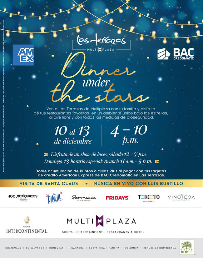 Tegucigalpa- Multiplaza siempre pensando en brindar las mejores y más novedosas actividades de entretenimiento familiar, invita a todos sus clientes a visitar Las Terrazas para disfrutar de un evento inolvidable “Dinner Under The Stars” (Cena Bajo las Estrellas) en un ambiente cómodo y con todas las medidas de bioseguridad.