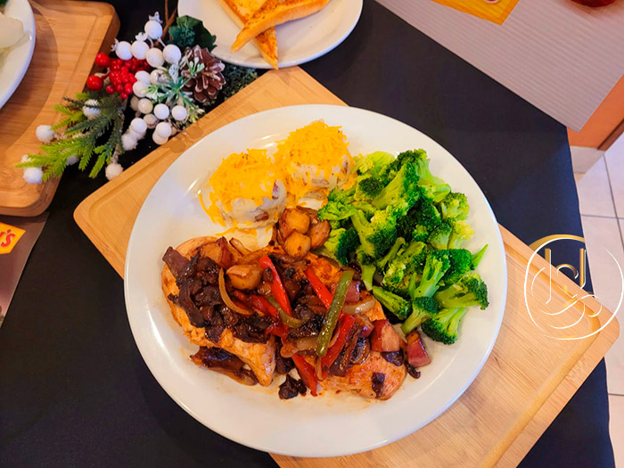 Apple Bourbon Chicken: Dos jugosos filetes de pechuga de pollo a la plancha cubierto con una guarnición de manzana roja y vegetales caramelizados en salsa Bourbon, acompañado de dos complementos de tu elección. Servido con pan o tortilla.