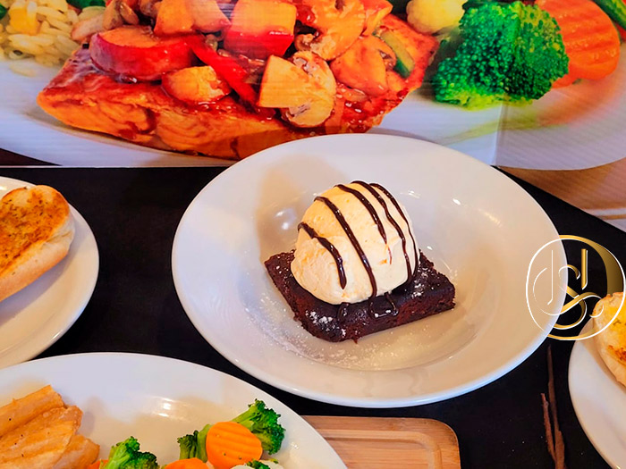 Cream Brownie: Delicioso brownie hecho de chocolate premium cubierto con chocolate, helado de vainilla y azúcar glas.