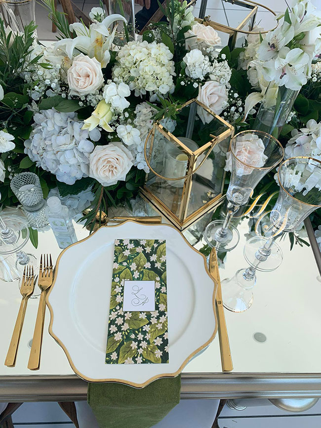 En la fiesta se sentía el amor y alegría en una estancia bellamente decorada con flores primaverales en tonos blancos, variedad de follajes verdes junto a hermosos faroles de cristal.