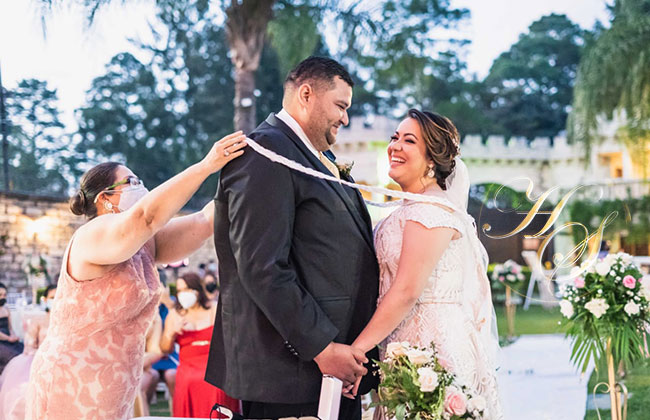 La ceremonia religiosa fue oficiada por la pastora Rebeca Salcedo, quien en nombre de Dios los unió en matrimonio, llenos de alegría se unieron los padres de los contrayentes: Santos Salgado, Isabel Guillén Estrada, Mario Andino, Mary Duarte y Bertha Cardona tía de la novia, algunos de ellos manera virtual.