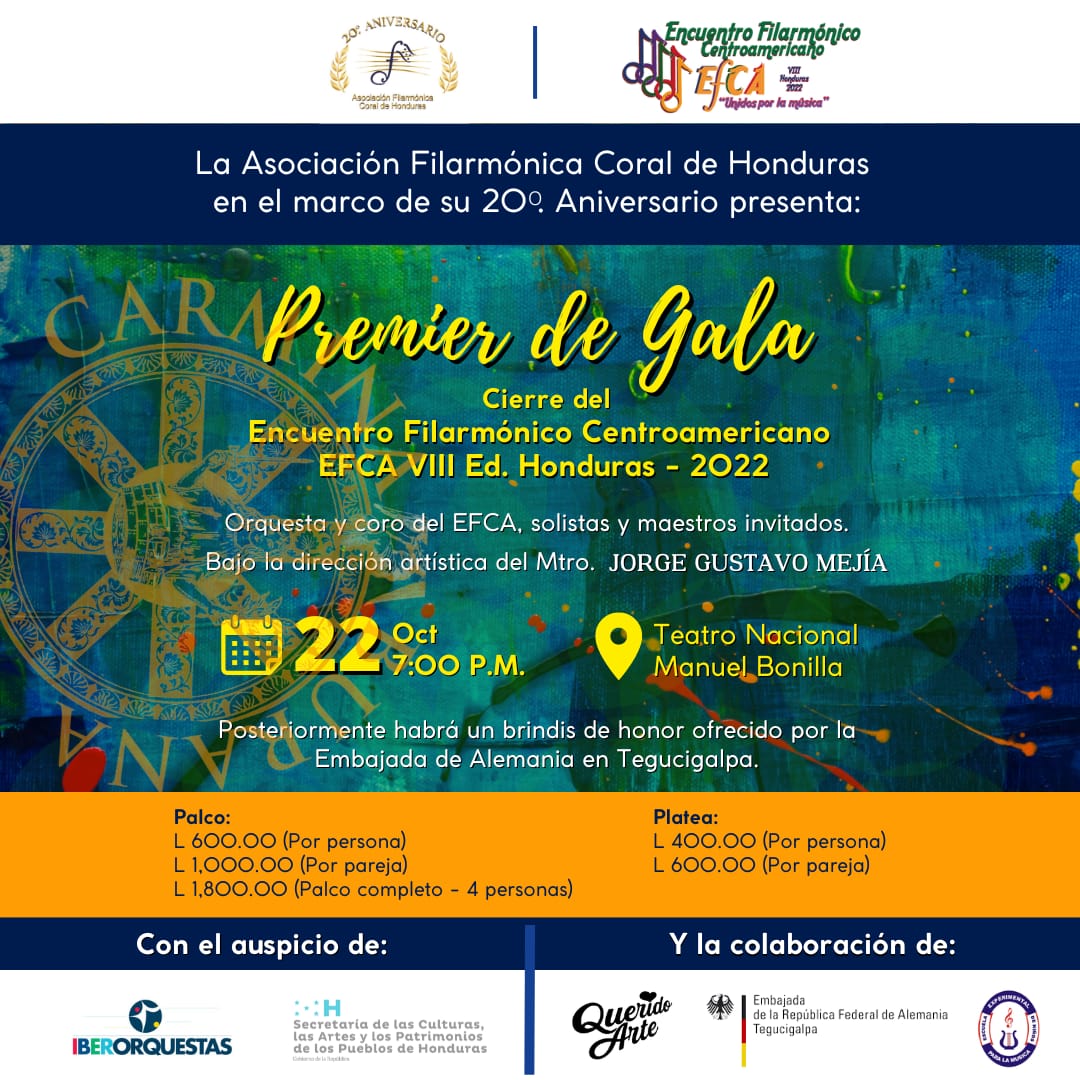 Se realiza un encuentro Filarmónico Centroamericano que reúne a artistas de toda Centroamerica y México con el objetivo de educar a los artistas , formarlos con clases magistrales y también mantenimiento de instrumentos, están reunidos en Honduras y presentarán en el marco de las celebraciones de los 20 años de la Asociación Filarmónica Nacional de Honduras y la celebración anual de su «Festival de Bethoveen’ la espectacular obra de Karl Orff «Carmina Burana» y parte de la Novena Sinfónica de Bethoveen’conocida como la «Oda a la Alegria».