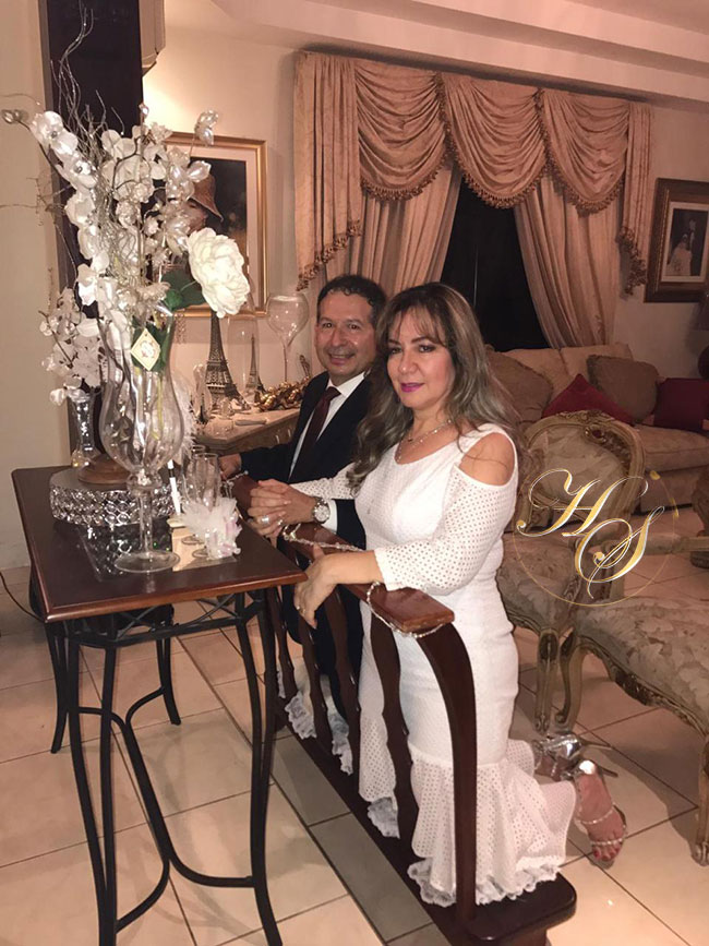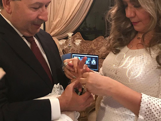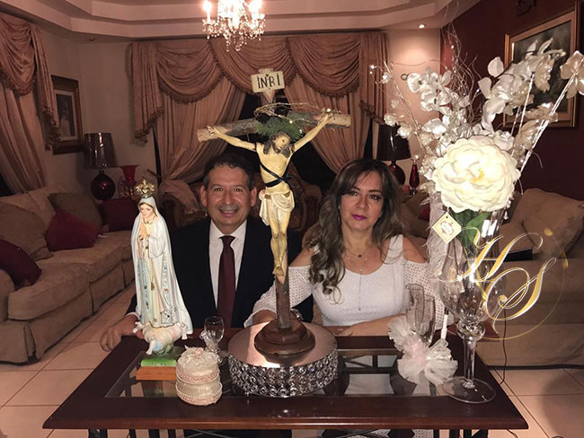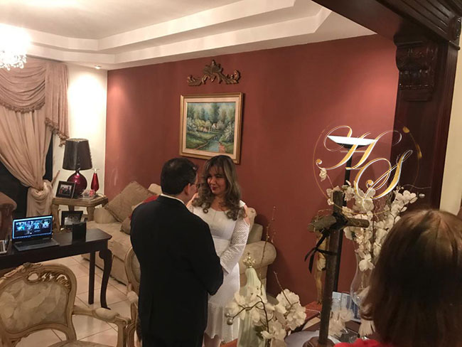 La renovación de votos se hizo en la intimidad de su hogar por medio virtual, realizada por el sacerdote Luis Amador, quién ofreció una especial bendición a los enamorados esposos, que por circunstancias de la pandemia mundial no podían realizar su boda.