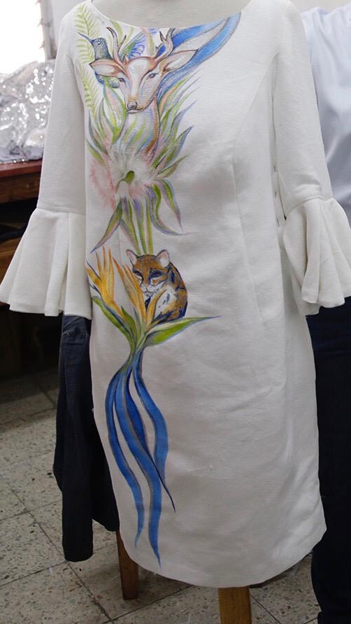 El vestido lleva una linda pintura acrílica que fue hecha a mano por “Yoyo” y Fernando Camazots; en la cual se combinan colores pasteles en tonalidades verdes, azules, cafés, naranjas y destellos plateados que dan realce a lo pintado.