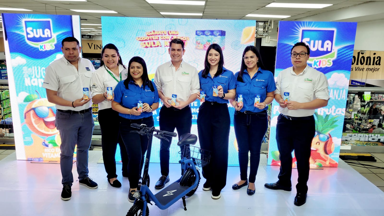 “Nuestra marca SULA tiene el compromiso de mantenerse a la vanguardia en promociones y productos alimenticios con alto valor nutricional, hoy estrenamos la nueva imagen de la bebida de jugo de naranja SULA KIDS y extendemos el portafolio con el sabor ponche de frutas. Además formamos una alianza estratégica con supermercados La Colonia en la cual traemos una super promoción: la rifa quincenal de una Scooter eléctrica y descuento por la compra de productos SULA KIDS”, explicó Sherly Madrid, Gerente de marca JNBR.