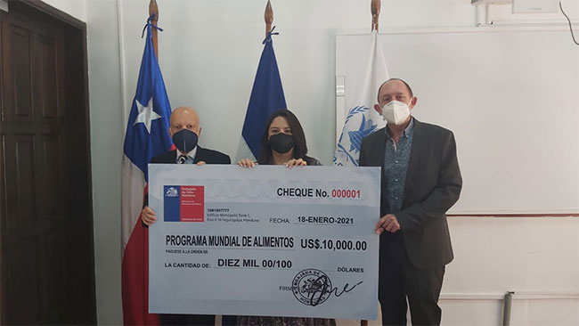El aporte, que será utilizado para ayudas humanitarias, fue entregado por el embajador de Chile en Honduras, Enrique Barriga Larraín al director adjunto del Programa Mundial de Alimentos (PMA) en Honduras, Etienne Labande, organismo que será el responsable de su ejecución en coordinación con el Gobierno de Honduras a través de COPECO.