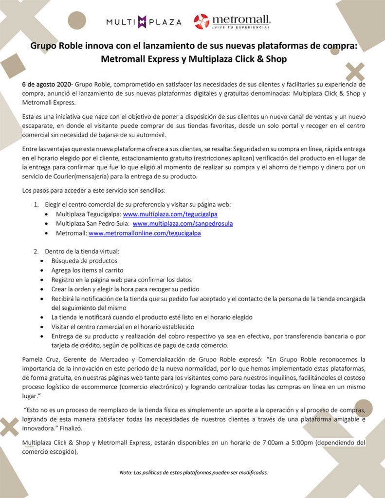 Grupo Roble innova con el lanzamiento de sus nuevas plataformas de compra: Metromall Express y Multiplaza Click & Shop – Honduras en Sociedad