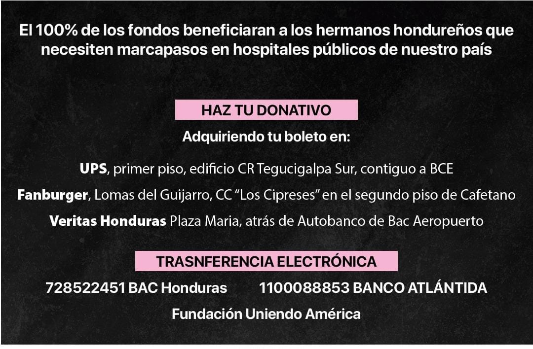 Para hacer su donativo es muy sencillo, adquiera su boleto a tan solo: Palco L 1,000 y General L 800 en UPS, primer piso, edificio Club Rotario Tegucigalpa Sur, contiguo a BCE, Fanburger, Lomas del Guijarro, Centro comercial Los Cipreses en el segundo piso de Cafetano, Veritas Honduras Plaza María, atrás del autobanco de Bac Aeropuerto, asimismo, puede hacer sus transferencias a través de las diferentes cuentas de Bac Honduras al número 728522451 y Banco Atlántida 1100088853 a nombre de la Fundación Uniendo América.