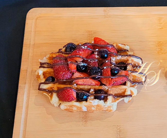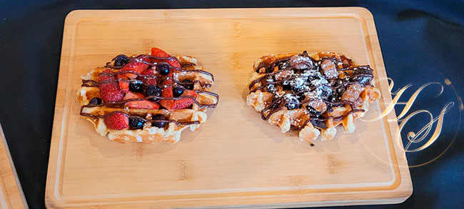 Sweet Caramel Berries: Un Belgian Waffle con deliciosas fresas y blueberries, caramelo y chocolate fudge. Cubierto con azúcar glas.