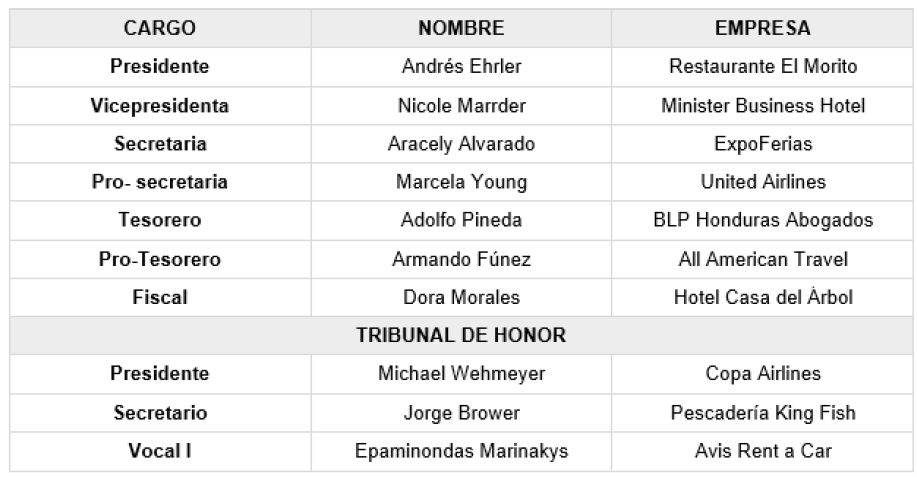El día jueves 25 de abril del 2024, la Asamblea General de Socios de la Cámara Nacional de Turismo de Honduras (CANATURH), reunida en el Consejo Hondureño de la Empresa Privada (COHEP), eligieron las nuevas autoridades de Junta Directiva y Tribunal de Honor para el periodo 2024-2026, la cual esta conformada por los siguientes socios: