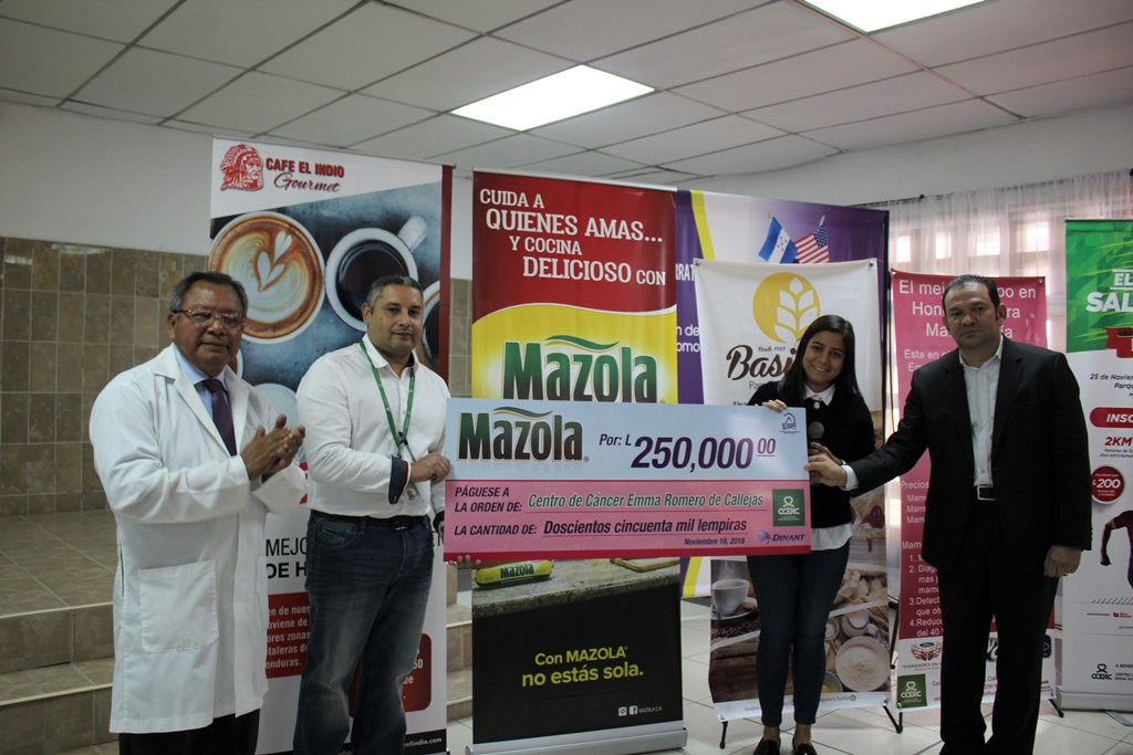 Dinant, mediante su marca Mazola, entregó un donativo de L 250,000.00 al Centro de Cáncer Emma Romero de Callejas (CCERC) gracias al exitoso desarrollo que tuvo, por segundo año consecutivo, su campaña “Con tu compra apoyamos la lucha contra el cáncer de mama”.