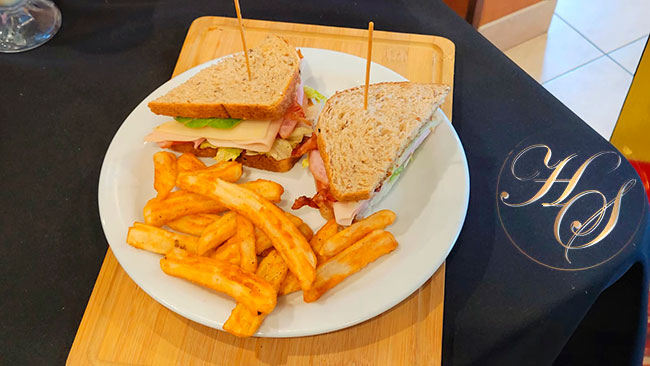 Cali Club Sandwich: finas rebanadas de jamón de pechuga de pavo, jamón deli, tocino crujiente, queso suizo, aguacate fresco, lechuga, tomate y mayonesa en un pan de 7 granos tostado. Servido con papas fritas de tu elección.