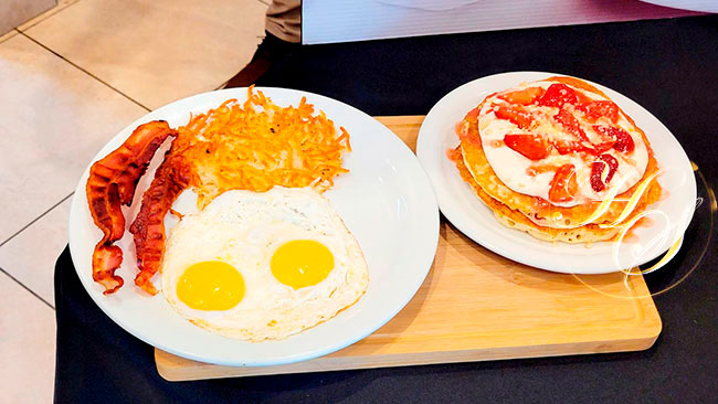 Tu desayuno no será igual una vez que pruebes los Shortberry Dream Cake: Buttermilk pancakes cubiertos con cremoso budín de vainilla, fresas frescas, pedazos de galleta de mantequilla y salsa de fresas. Servidos con huevos, papas hash brown, más tiras de tocino o salchichas