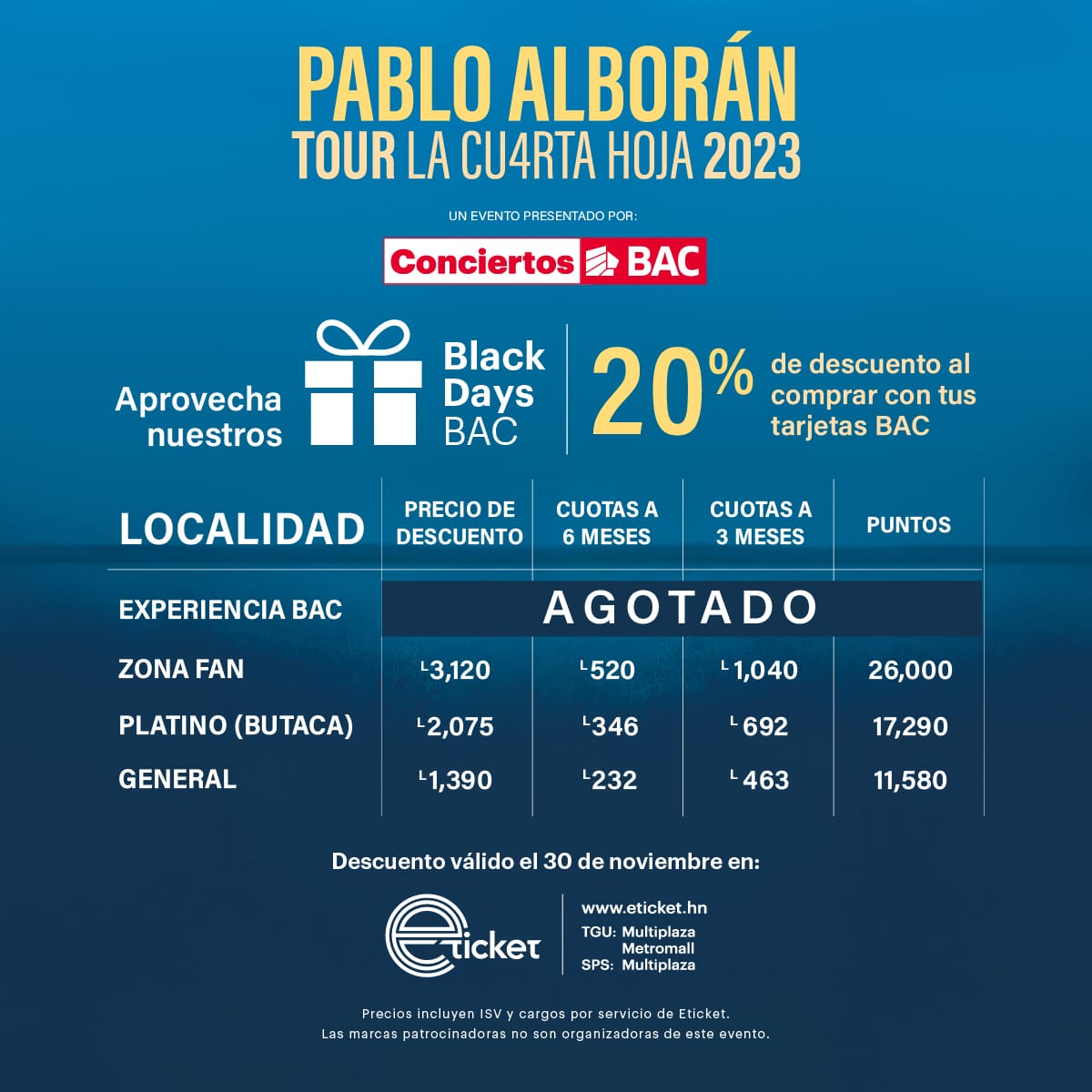 • Descuento del 20% al 30 de noviembre en quioscos de Eticket y en eticket.hn con tarjetas BAC