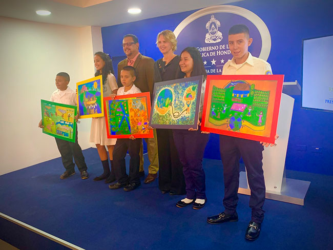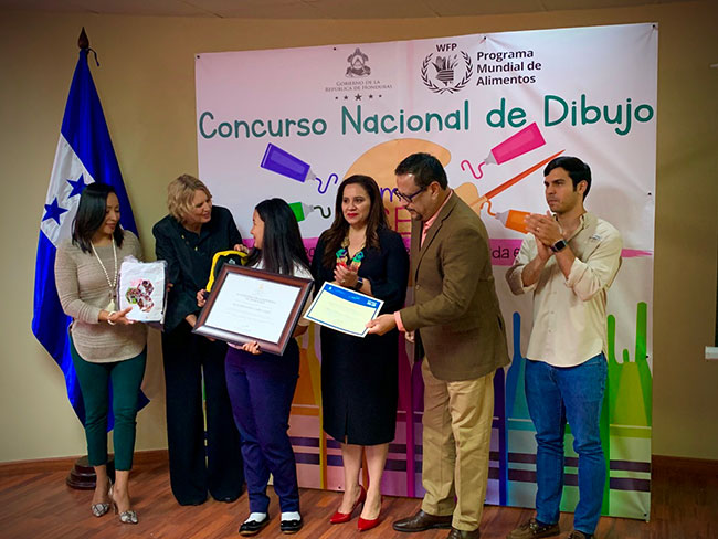 La Primera Dama de Honduras, Ana García de Hernández junto al representante del Programa Mundial de Alimentos (WFP), Judith Thimke, ministro de la Secretaria de Educación (SEDUC), Arnaldo Bueso y la viceministra de la Secretaria de Desarrollo e Inclusión Social (SEDIS), Lissi Matute Cano, recibieron de diferentes regiones de Honduras a los cinco primeros lugares del Concurso Nacional de Dibujo “Hambre Cero: ¿Porque es importante para ti recibir una comida en la Escuela?” que se realizó a nivel nacional en las escuelas públicas beneficiadas por el Programa Nacional de Alimentación Escolar (PNAE) que implementa el Gobierno de Honduras.