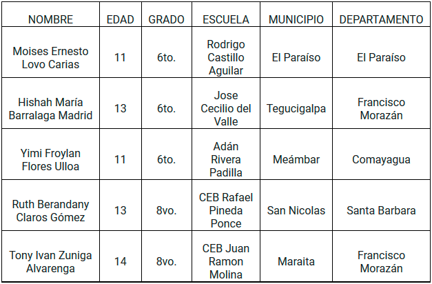 Los dibujos ganadores fueron seleccionados por reconocidos artistas nacionales como ser: Carolina Carías y Francisco Pinto Rodezno (QDDG), quienes, junto a representantes de la SEDUC, SEDIS y WFP tuvieron el honor de elegir las cinco mejores obras de más de 180 recibidas de todos los departamentos a nivel nacional.