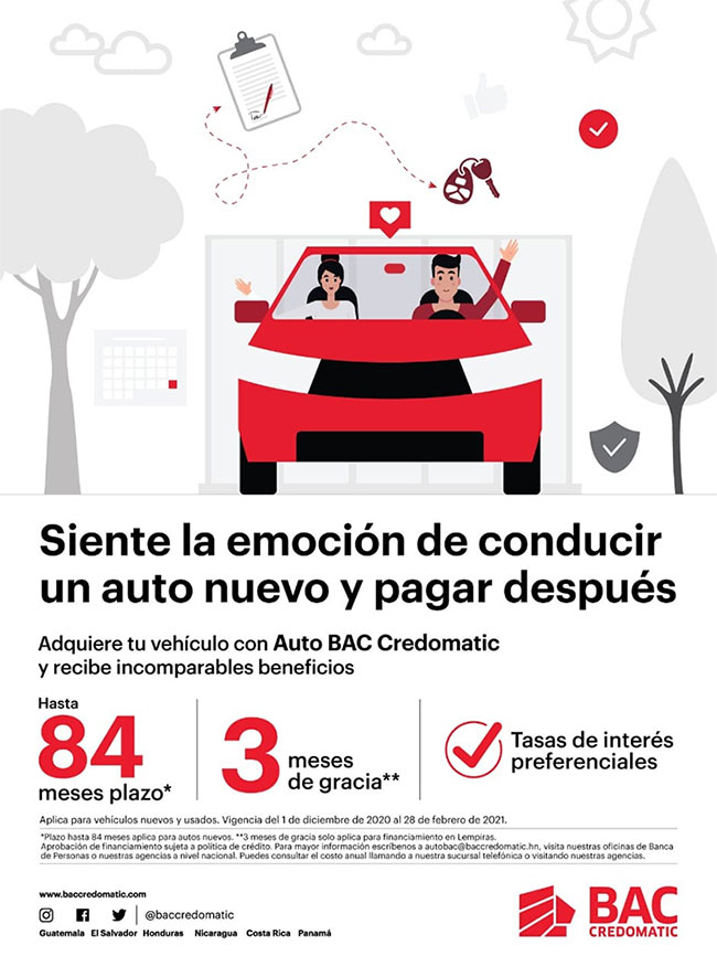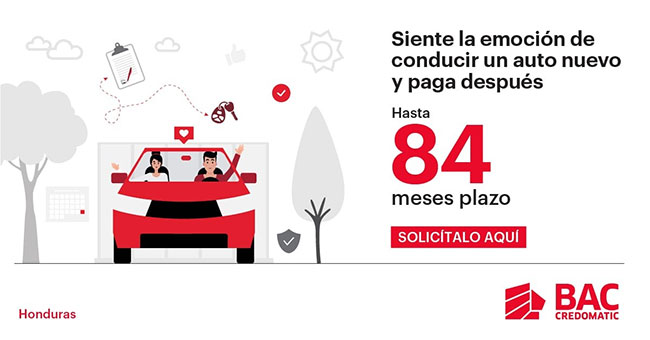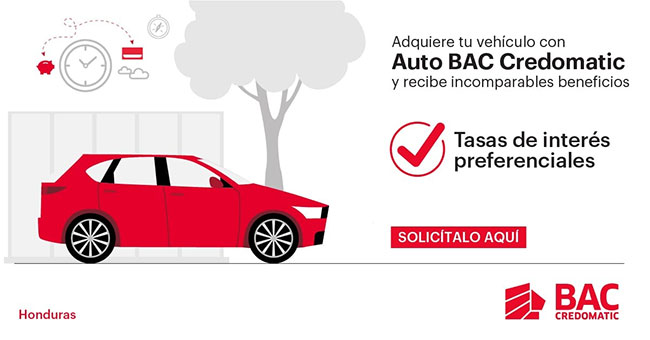 Tegucigalpa.- BAC Credomatic líder en el mercado, pensando en el beneficio de sus clientes de lograr adquirir un vehículo, pone a disposición los créditos de Auto BAC Credomatic con las tasas y plazos más competitivos que faciliten a los usuarios la compra de sus automóviles.