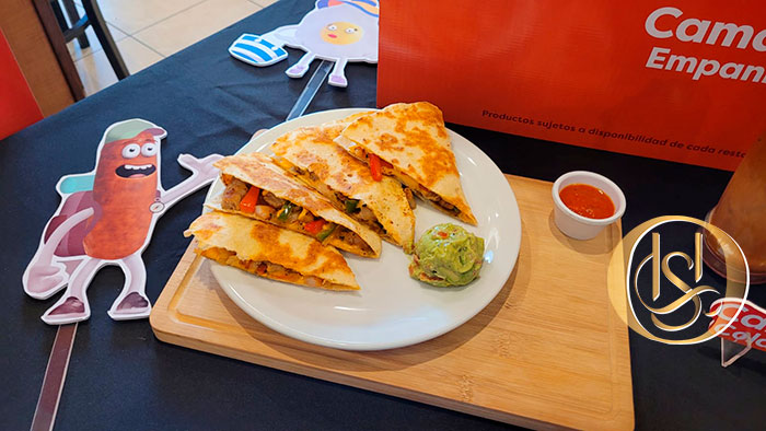 Shrimp & Sausage Quesadilla: Tortilla de harina rellena de camarones al ajillo con trocitos de salchicha, pimientos y cebollas asadas al fuego, queso americano derretido y pico de gallo. Servido con salsa marinara y guamacole.