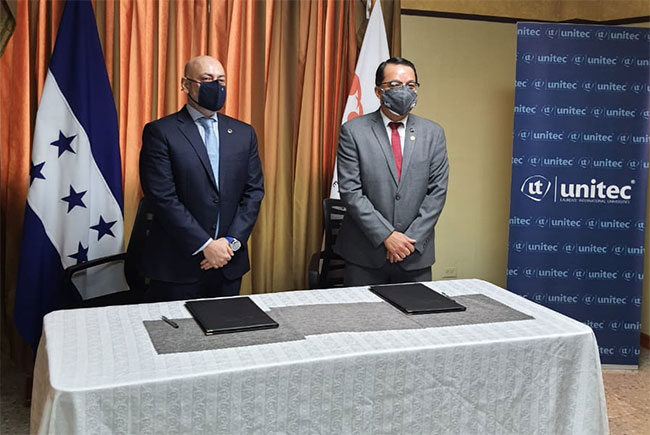 En el despacho de la Fiscalía General de la República, el Doctor Marlon Brevé, Rector de la Universidad Tecnológica Centroamericana (UNITEC) y el Abogado Oscar Fernando Chinchilla, Fiscal General del Ministerio Público (MP), firmaron un convenio para potenciar la educación y formación en las carreras en el campo legal y de investigación.